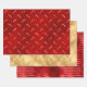 This glam holiday wrapping paper assortment features a pattern of gold faux foil candy canes on a red faux foil background; a gold faux foil art deco fan pattern; and a red satin faux foil stripe pattern.