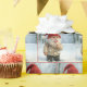 In a snowy forest, a whimsical gnome with a red hat enjoys a candy cane in snowflakes.