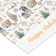 White background with a traditional Scandinavian style Christmas farmhouse decor, gnomes, wood logs, pine trees. Text: Happy Holidays. Golden letters.