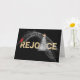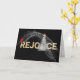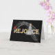 Abstract sparkling light streak with red cardinal, holiday white tree and gold REJOICE text on a black background for Christmas.