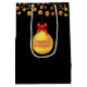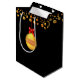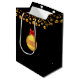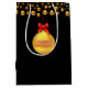 Beautiful gift bag with a big golden Christmas ball and golden polka dots on black background. Happy holidays text can be personalised.