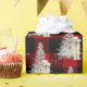 Cute golden retriever puppy with Santa hat and white holiday tree in snowflakes on red and black buffalo plaid.
