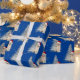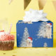 Cute golden retriever puppy with Santa hat and white holiday tree in snowflakes on blue background.