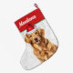 So sweet, this two-sided Christmas stocking has a watercolor illustration of a holiday dressed Golden Retriever dog and your pup's name on both sides with a woof word art background.
