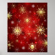 Red Christmas background with gold and white jewellery snowflakes. Golden snowflakes.