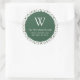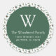 This festive Christmas return address sticker features a green circle on a pattern of winter greenery, including holly leaves, red berries, and mistletoe sprigs, on a white background. Personalise the design with your monogram initial and family name in white serif font, with your address below in sans serif.