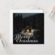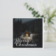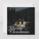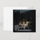 The card shows an atmospheric, wintry scene with a small, illuminated wooden hut in the middle of a snow-covered forest. The warm light source inside creates a beautiful contrast to the dark, peaceful surroundings. The elegant "Merry Christmas" lettering in white gives the motif a festive touch. 🎄✨