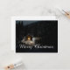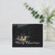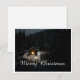 The card shows an atmospheric, wintry scene with a small, illuminated wooden hut in the middle of a snow-covered forest. The warm light source inside creates a beautiful contrast to the dark, peaceful surroundings. The elegant "Merry Christmas" lettering in white gives the motif a festive touch. 🎄✨
