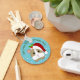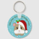 Cute brown and white guinea pig ready for Christmas wearing a red and white Santa hat. Above him is a template in green lettering to add your own festive message to personalise this adorable key chain. The background is blue dotted with white falling snowflakes.