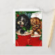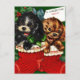 Vintage Cocker Spaniel puppies in Christmas stockings with "Christmas Hello" above them on a tag above them. Restored image.