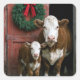 A Hereford cow and her calf stand at the entrance of a red, rustic barn, decorated with a green pine wreath and red bow