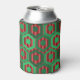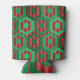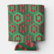 This can cooler has a geometric design of hexagons in four shades of green on a field of stripes in two shades of red.