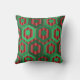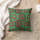 This throw pillow has a geometric design of hexagons in four shades of green on a field of stripes in two shades of red.