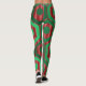 These leggings have a geometric design of hexagons in four shades of green on a field of stripes in two shades of red.