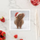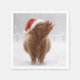 A charming Highland cow is catching snowflakes with its tongue, its fluffy brown fur glistening against a serene snowy landscape, and wearing a vibrant red Santa hat as snowflakes fall
