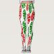 These leggings have a repeating pattern of ovals in red and green with scattered white ovals all on a field of white.