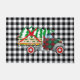 This Christmas holiday doormat is shown with a country style black and white gingham plaid print with a festive car art print.