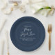 This design features Christmas holiday modern simple elegant, traditional winter minimalist navy blue, chic minimal calligraphy script font, modern hand-lettering script font, classic family name contemporary, whimsical typography template, with elegant flourish vintage pattern, peace joy and love saying, a holiday Christmas party dinner dessert paper plate