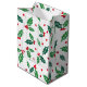This Christmas holiday gift bag is shown in a festive winter holly print.