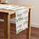 Holiday table runner is shown with a festive candy cane style Merry Christmas print.