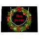 Paper gift bag is shown in black with a festive holiday wreath print.