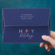This design features Christmas holiday navy blue festive, clean trendy classic traditional minimal, modern elegant simple trendy,5x7 a7 cute whimsical, return address back flap, simple minimalist minimal fun, with minimal holiday blue and white snowflakes, great Christmas holiday mailing supplies, coordinating matching envelope, holiday Christmas greeting envelope