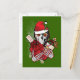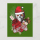 Fun goth skull wearing a Santa hat and holding a gift and Christmas stocking filled with holiday goodies. Art of artist Margaret Loftin Whiting.