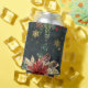A luxurious and festive Christmas holiday design featuring a dark green forest winter's night with shimmery golden snowflakes and watercolor-painted poinsettias, pine cones and red berries under the light of a warmly lit lantern with a shiny red ball ornament on ribbon falling in mid-air