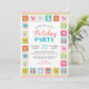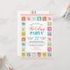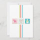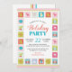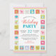 This holidays design features a colourful Christmas postage stamp frame with Christmas trees, reindeer, candy canes, snowmen, decorations, gifts, holly, snowflakes surrounds your custom HolidayParty invitation information. Personalise by editing the text in the text boxes. Modern and fun, perfect for the holidays. On the reverse is a striped pattern with three postage stamps in the middle.