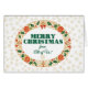 A festive Christmas card 'From All of Us', with a Christmas wreath of Holly, Ivy, Poinsettias, Fir Cones, Christmas Roses and a matching red bow, outlined in gold-effect, with gold-effect snowflakes on a white background. A custom front card is also available.