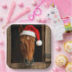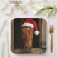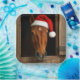 A horse wears a red Santa hat as it peeks out from a wooden stable, its warm tones beautifully contrasting with the festive colors