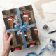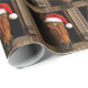 A horse wears a red Santa hat as it peeks out from a wooden stable, its warm tones beautifully contrasting with the festive colors