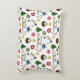 Christmas colourful surface pattern design with illustrations of a Christmas pudding, star, baubles, snowflakes, snowman, candy cane, Christmas tree, Christmas gift parcels and stocking.