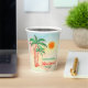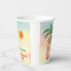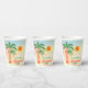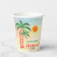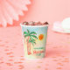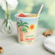 These colourful paper cups are decorated with palm trees and string lights on a watercolor background.