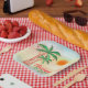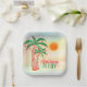 Invite family and friends to your Christmas themed celebration and decorate it with these island style paper plates featuring hand drawn palm trees decorated with lights on a watercolor background.