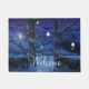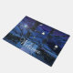 A winter night, looking over a gate flanked by two trees down into a snow-covered glen between rocky hills, filled with little farms and hedgerows and stone walls. A warm glow shines from many windows, Christmas lights sparkle on trees and fences, and a Christmas star beams from the roof of a manor house, all under the rays of a full moon.