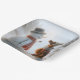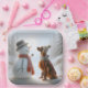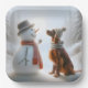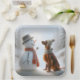 A snowman and an Irish Setter dog both wearing scarves share a moment of companionship in a snowy forest setting