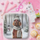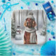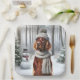 An Irish Setter dog wearing a grey knitted hat and scarf stands in a snowy forest next to a snowman for Christmas.