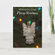 Festive Angel dressed with flowers and a gold star halo and Joy banner, with outside colourful holiday tree lights in the background. Leave message inside card, or personalise. Personalise with your family name. Backside has smaller artwork of old-fashioned green Christmas tree with yellow star, Peace. Original Photography, Artwork, Verse Design © TamiraZDesigns.