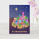 A joyful Christmas card for a Wonderful Mum, with a starry sky, the three wise men on their camels in the distance, and Joseph, Mary and a donkey making their way into the brightly coloured little town of Bethlehem. The lettering, Christmas Joy, and stars are in gold-effect paint (not gold foil). A mixed-media design by Judy Adamson.