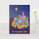 A joyful Christmas card for an Aunt, with a starry sky, the three wise men on their camels in the distance, and Joseph, Mary and a donkey making their way into the brightly coloured little town of Bethlehem. The lettering, Christmas Joy, and stars are in gold-effect paint (not gold foil). A mixed-media design by Judy Adamson.