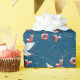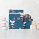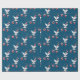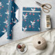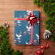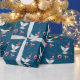 White dove with string JOY Christmas message in snowflakes on blue background.