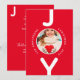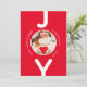 A simple modern minimalist Christmas card in red and white. On the front: A classic red background, with the word JOY written with white bold letters. The letter O is used as a photo frame. Personalise and add your own family photo, name and year.
