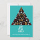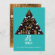 This is a colourful, modern Joy to the world Christmas card. You can personalise it by adding your own message and names. This is a modern twist on an old classic. It features symbols from the Nativity story, including angels, donkey, three kings, holly, mistletoe. It is configured into the shape of a tree and the stump of the tree has the words, 'Joy To The World' in white calligraphy. The back of the card is in faux gold, featuring gold stars.