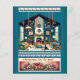 A cosy living room is decorated for Christmas with a warm fireplace and a beautifully adorned tree, surrounded by family and gifts. Festive garlands and candy canes hang from the ceiling, adding to the cheerful atmosphere. A greeting at the bottom wishes "Christmas Joy To You!"