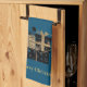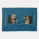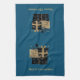 This kitchen towel is shown in teal blue with a short stack of black and gold coloured Christmas packages along with matte gold coloured text of Merry Christmas.
