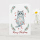 A charming holiday card illustrated in the soft, nostalgic Tradition Treasures style. It features a round-eyed grey kitten sweetly tangled in glowing Christmas lights, framed by festive pine branches and red berries. The watercolour textures give it a timeless cosy feeling. A delightful choice for cat lovers and anyone who enjoys sending a touch of Christmas whimsy and warmth.