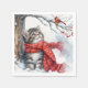 A fluffy kitten wearing a red winter scarf as it gazes up at a cardinal perched on a snow-covered branch.