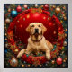 Golden retriever lying gracefully within a festive wreath. The wreath is adorned with vibrant red and gold decorations, including shiny ornaments and seasonal foliage, creating a warm and cheerful atmosphere. The background is a rich, deep red, which complements the colours of the wreath. The dog's expression is calm and endearing, and it serves as the focal point of the composition, evoking feelings of joy and holiday spirit.