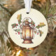 The lantern is not alone, however. It is nestled amidst lush Christmas greenery that adds a vibrant contrast to the scene.
